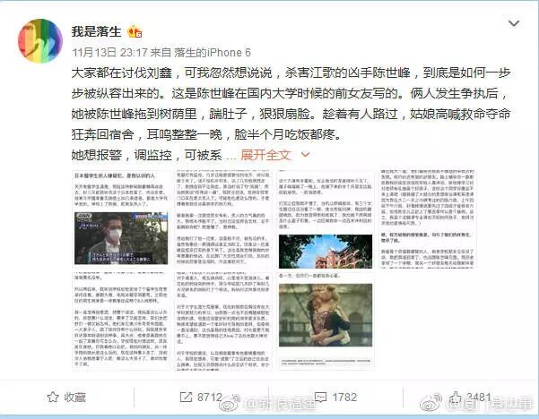 在江歌案發(fā)生后曾在網(wǎng)上發(fā)帖