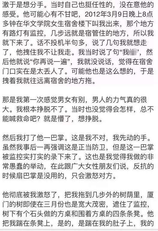 2012年3月9日晚上8點(diǎn)多,兩人發(fā)生口角,她動手扇了陳世峰一耳光,隨后陳世峰將她拽到學(xué)校樹蔭里,一腳踹在她肚子上,邊罵人邊狠狠地回扇了她。“那個力道有多重呢,反正我當(dāng)時是直接聽不見了,腦子嗡嗡嗡響了一晚上。”該女網(wǎng)友自述,后來她高呼救命,趁著陳世峰閃神,才得以逃脫。