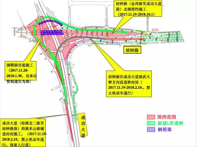 2017年11月20日至2018年1月30日,主線橋第6聯(lián)左右幅、H匝道橋第4聯(lián)鋼箱梁吊裝期間,成功大道主線雙向、枋鐘路出島方向、成功大道左轉(zhuǎn)枋鐘路匝道夜間各臨時(shí)封閉2~3晚(具體以管制通告為準(zhǔn))。