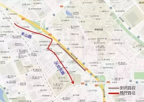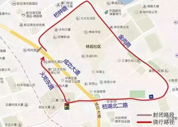 成功大道(枋湖北二路至枋鐘路段)西側禾山路輔道封閉施工期間,車輛通過火炬東路繞行。
