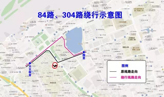 太古宿舍往圍里方向,行至枋鐘路金尚路口,改經(jīng)枋鐘路、林后路、岐山北路接原線路運(yùn)行。返程線路走向不變。