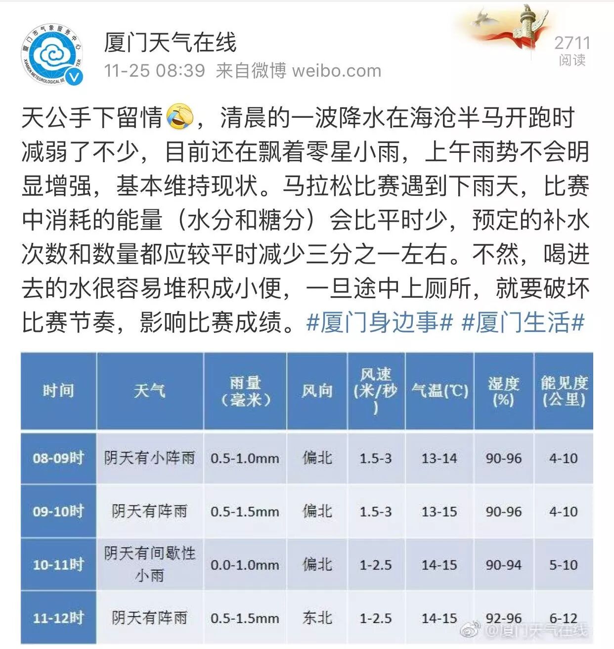 臺(tái)海網(wǎng)11月25日訊 據(jù)廈門晚報(bào)報(bào)道 暖心:運(yùn)動(dòng)員物資包里 多了件輕薄雨衣 針對(duì)雨天情況,賽事組委會(huì)提前做好了多方位準(zhǔn)備,除了給運(yùn)動(dòng)員發(fā)短信,提前預(yù)告了天氣的情況,還在運(yùn)動(dòng)員物資包里增加了輕薄的雨衣。 運(yùn)動(dòng)員完賽后 喝碗姜湯驅(qū)寒 在賽后康復(fù)方面,現(xiàn)場(chǎng)還為運(yùn)...