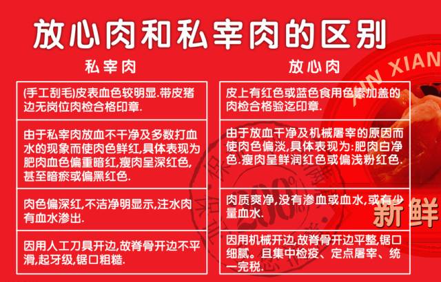 此外,從定點屠宰廠出來的豬肉表皮蓋有生豬檢疫合格章和紅色的品質(zhì)檢驗合格章,而私宰肉大多沒有蓋公章。