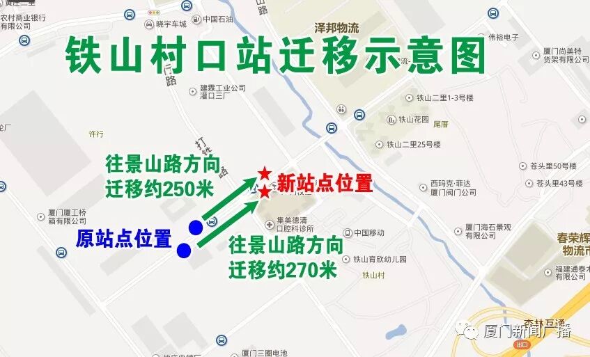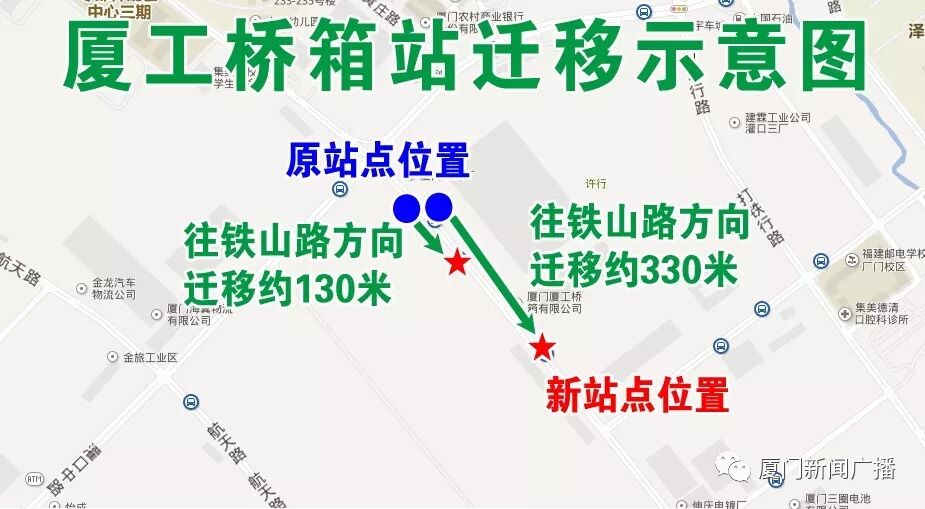 (三)灌口南路的“廈工橋箱”站雙向遷移 為進一步方便廈工橋箱廠區(qū)乘客出行,灌口南路的“廈工橋箱”站雙向遷移,涉及904路、941路、942路等3條線路,具體如下: 1、往灌南方向的“廈工橋箱”站往鐵山路方向遷移約330米。 2、往前場方向的“廈工橋箱”站往鐵山路方向遷移約130米。