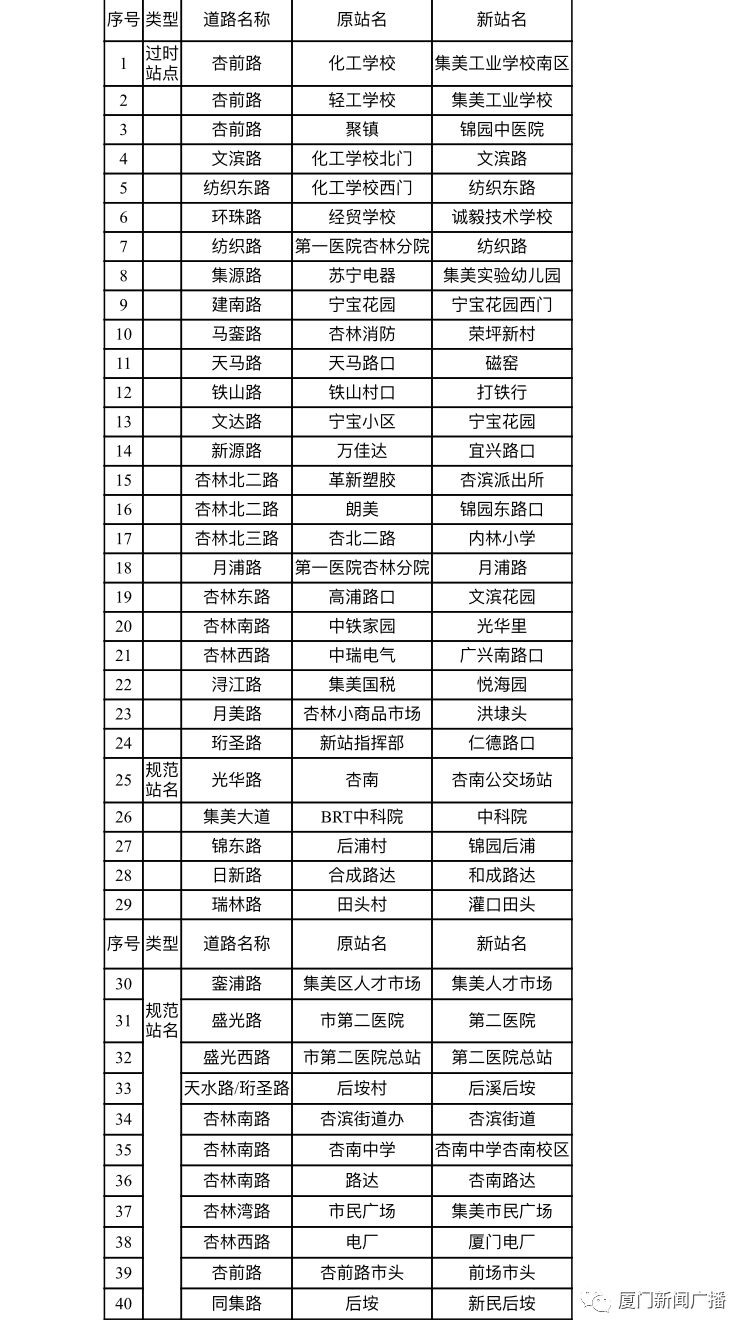 包括集美區(qū)輕工學(xué)校、化工學(xué)校在內(nèi)的40處公交站點更名。