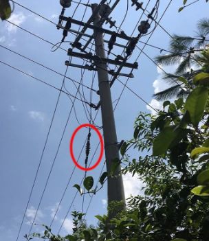 1、電桿上只有一條線路的情況:電線與橫擔之間有絕緣子,電不會傳導(dǎo)到電桿及拉線上。