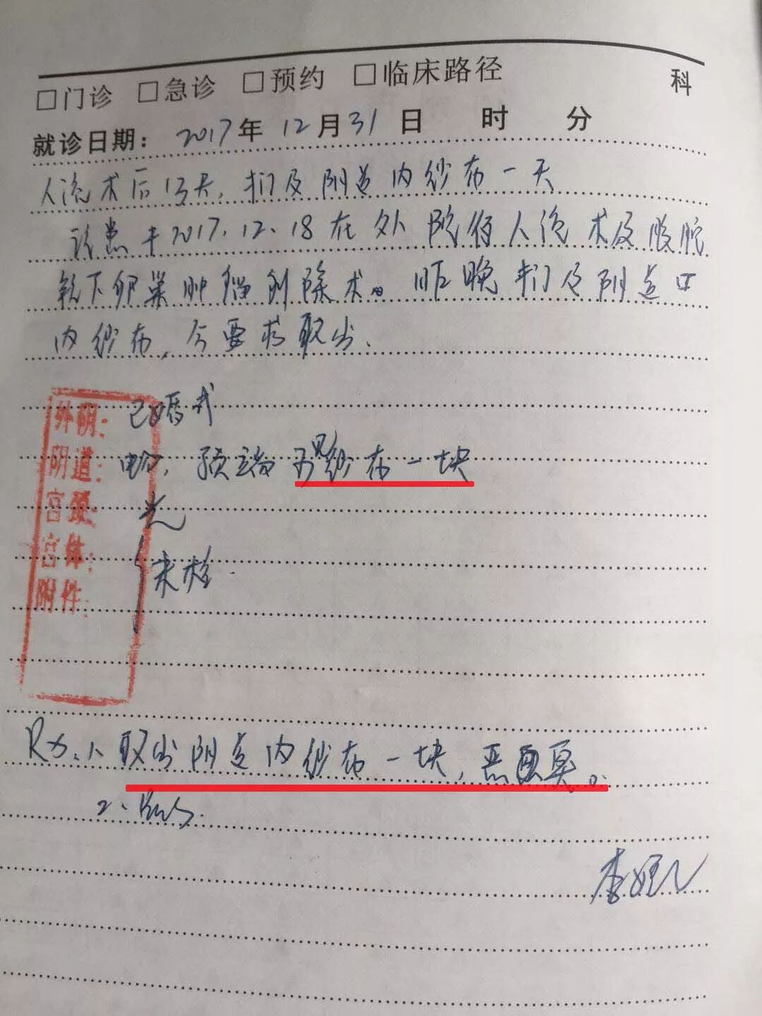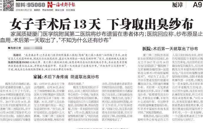 廈門第二醫(yī)院醫(yī)務(wù)部副主任李凱彥日前回應(yīng),孫女士于2017年12月18日在他們醫(yī)院做了“腹腔鏡下左卵巢畸胎瘤切除+盆腔粘連分解術(shù)+疤痕妊娠吸宮術(shù)”。術(shù)后為了止血,于當(dāng)日在患者宮腔內(nèi)放置球囊壓迫止血,并陰道內(nèi)填塞紗布。術(shù)后第一天見(jiàn)患者陰道流血不多,取出了球囊及紗布。“按理要先取出紗布,才能取出球囊,不知為什么還有紗布。但這種手術(shù)后陰道填塞遺留有紗布,和手術(shù)中留有紗布有本質(zhì)不同。”李凱彥強(qiáng)調(diào)說(shuō)。
