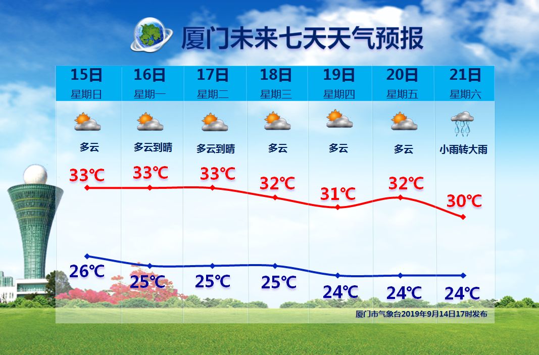 根據(jù)預(yù)測(cè),未來三天,廈門仍處在副熱帶高壓南側(cè)的偏東氣流影響下,將持續(xù)出現(xiàn)多云到晴的天氣,島內(nèi)白天最高氣溫可達(dá)33℃,島外內(nèi)陸地區(qū)還會(huì)高出1℃至2℃。在東北風(fēng)的吹拂下,夜晨將變得較為涼爽宜人,最低氣溫可降至25℃。