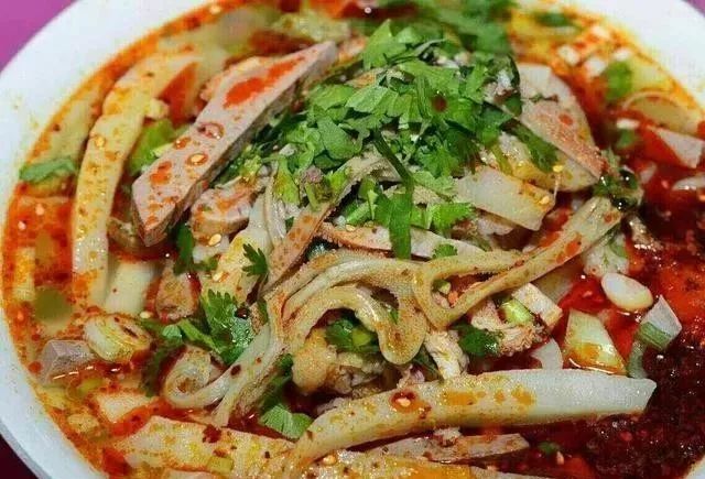 將羊的心、肝、肺、胃、腸,頭肉等燴制一起,吃的時(shí)候配上一碗熱乎乎的羊清湯,然后再撒點(diǎn)蒜苗和油潑辣子,光看著就已經(jīng)垂涎三尺了~