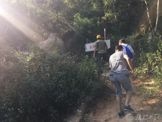 2017年,廈門日?qǐng)?bào)記者在五名北極星救援隊(duì)隊(duì)員的帶領(lǐng)下,向滾蛋谷“挺進(jìn)”。上山途中,坡度一點(diǎn)點(diǎn)變陡,腳下的小道,不是布滿碎石子,就是蓋滿草叢、藤蔓,走起來一會(huì)打滑,一會(huì)踩空。