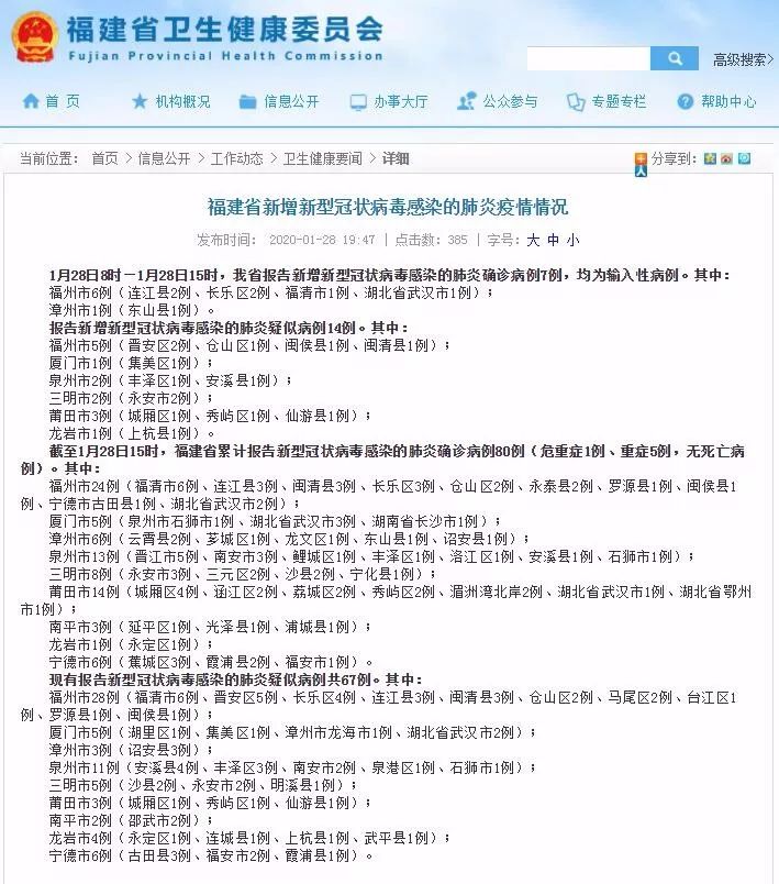 截至1月28日15時(shí),福建省累計(jì)報(bào)告新型冠狀病毒感染的肺炎確診病例80例(危重癥1例、重癥5例,無死亡病例)。其中: