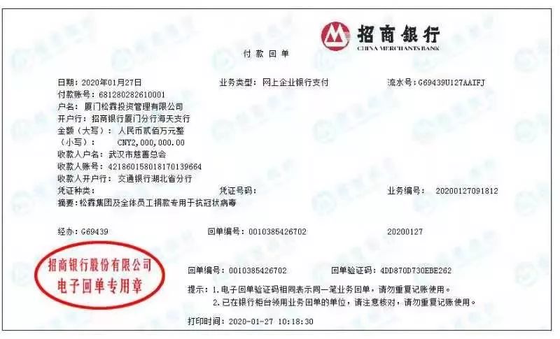 廈門松霖集團1月27日向武漢市慈善總會捐款首批200萬元,用于武漢前線抗擊疫情及防疫工作。