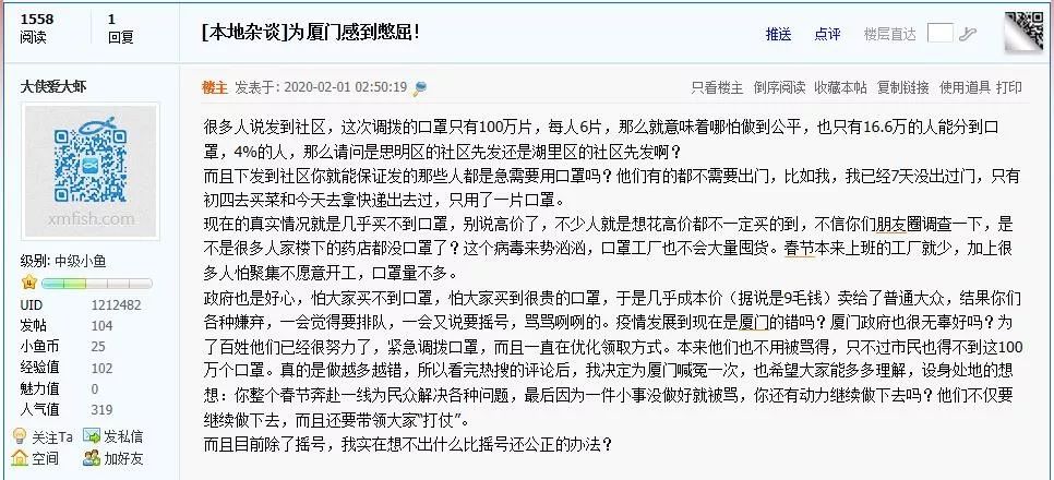 很多人說(shuō)發(fā)到社區(qū),這次調(diào)撥的口罩只有100萬(wàn)片,每人6片,那么就意味著哪怕做到公平,也只有16.6萬(wàn)的人能分到口罩,4%的人,那么請(qǐng)問(wèn)是思明區(qū)的社區(qū)先發(fā)還是湖里區(qū)的社區(qū)先發(fā)???