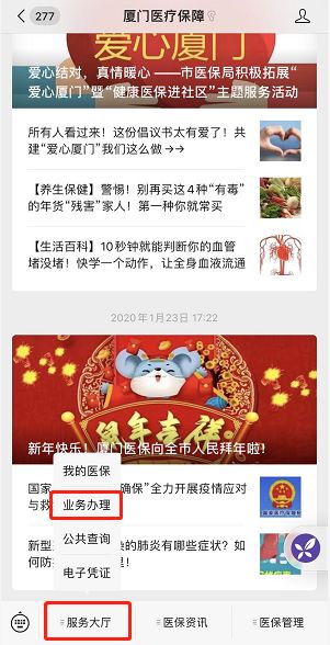 (1)通過(guò)“廈門(mén)醫(yī)療保障”微信公眾號(hào),綁定個(gè)人社??ㄖ?,點(diǎn)擊“服務(wù)大廳”→“業(yè)務(wù)辦理“,可辦理醫(yī)保經(jīng)辦業(yè)務(wù)。
