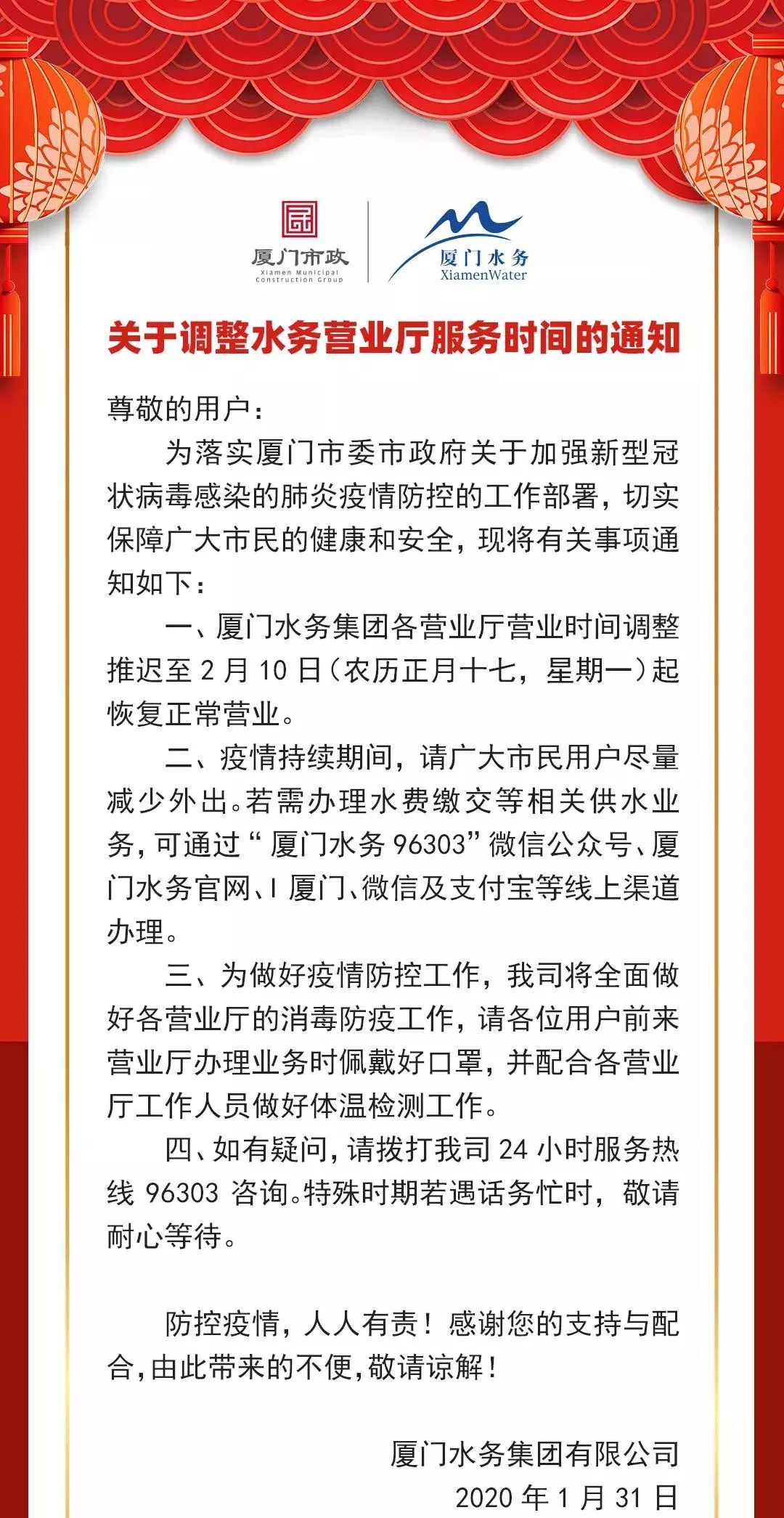 廈門(mén)水務(wù)營(yíng)業(yè)廳服務(wù)時(shí)間調(diào)整通知