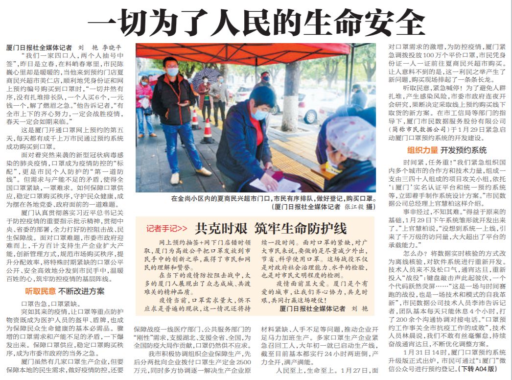 “我們一家四口人,兩個(gè)人抽號(hào)中簽”,昨日是立春,在料峭春寒里,市民陳巍心里卻是暖暖的,當(dāng)他來(lái)到預(yù)約門店夏商民興超市美仁店,順利地憑身份證和網(wǎng)上預(yù)約編號(hào)購(gòu)買到口罩時(shí),“一切井然有序,沒(méi)有扎堆排長(zhǎng)隊(duì),一個(gè)人買6個(gè),一元錢一個(gè),解了燃眉之急。”他告訴記者,“有全市上下的齊心努力,一定會(huì)戰(zhàn)勝疫情,春天一定會(huì)如期來(lái)臨。”