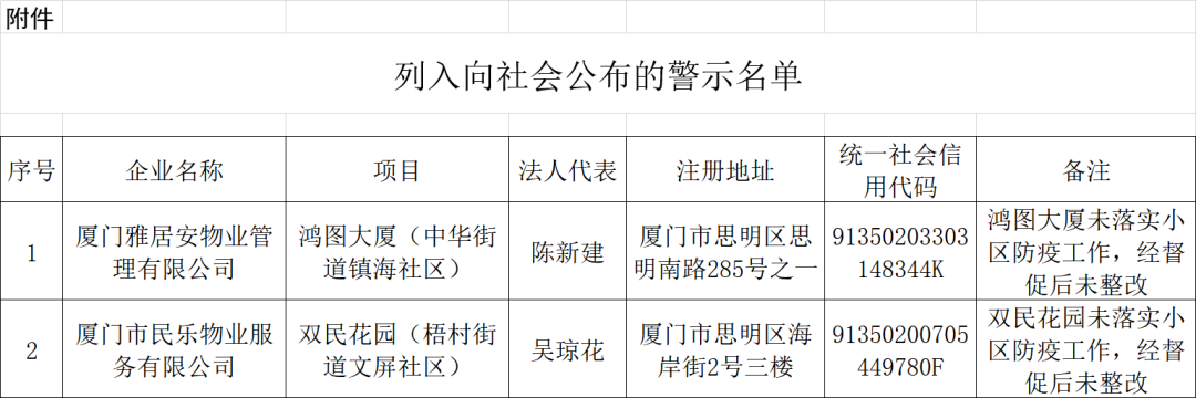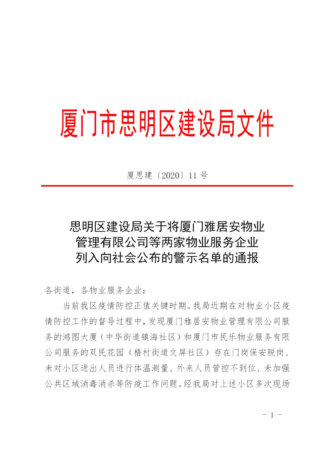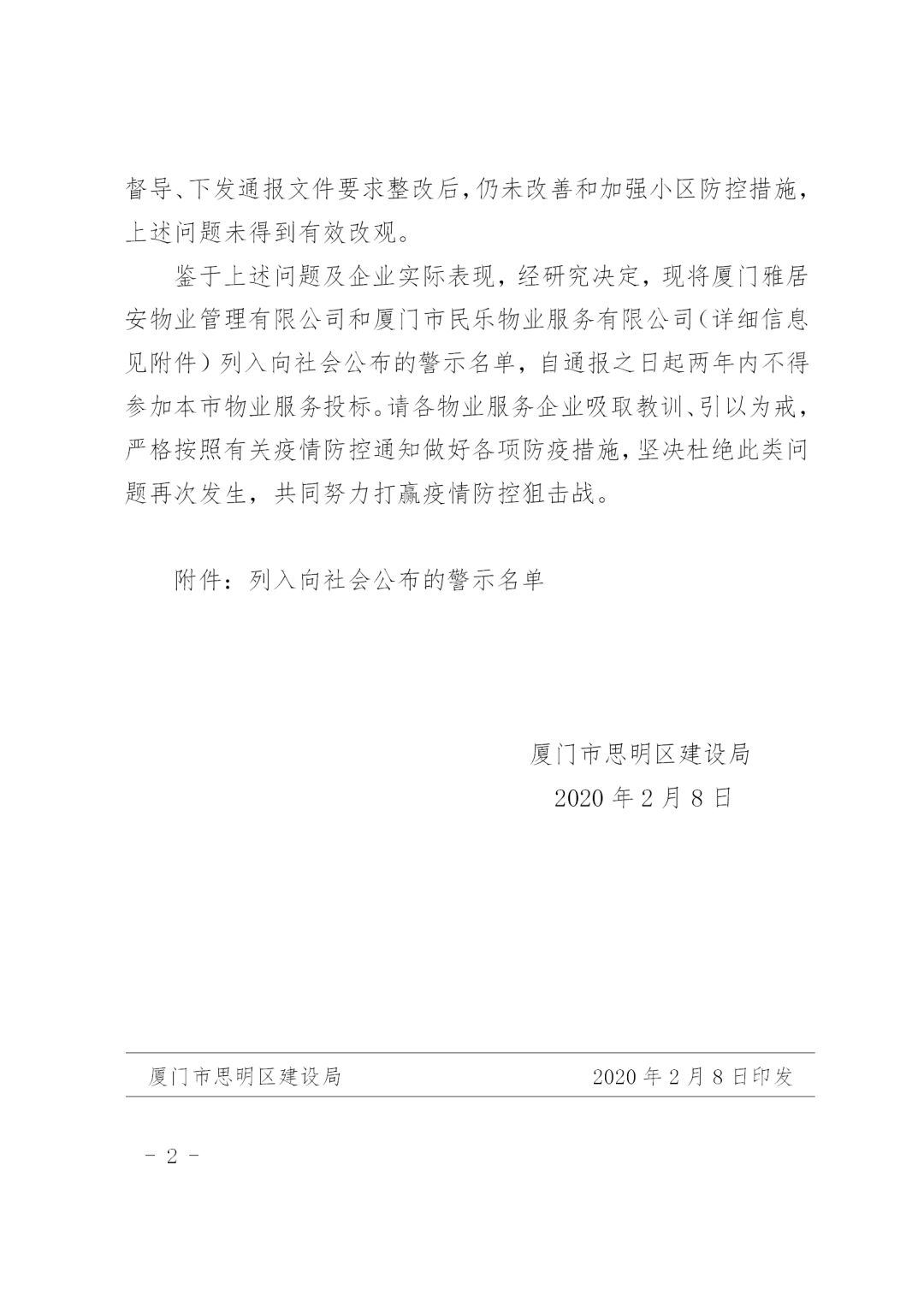 鑒于上述問題及企業(yè)實際表現(xiàn),經(jīng)研究決定,現(xiàn)將廈門雅居安物業(yè)管理有限公司和廈門市民樂物業(yè)服務(wù)有限公司(詳細(xì)信息見附件)列入向社會公布的警示名單,自通報之日起兩年內(nèi)不得參加本市物業(yè)服務(wù)投標(biāo)。請各物業(yè)服務(wù)企業(yè)吸取教訓(xùn)、引以為戒,嚴(yán)格按照有關(guān)疫情防控通知做好各項防疫措施,堅決杜絕此類問題再次發(fā)生,共同努力打贏疫情防控狙擊戰(zhàn)。