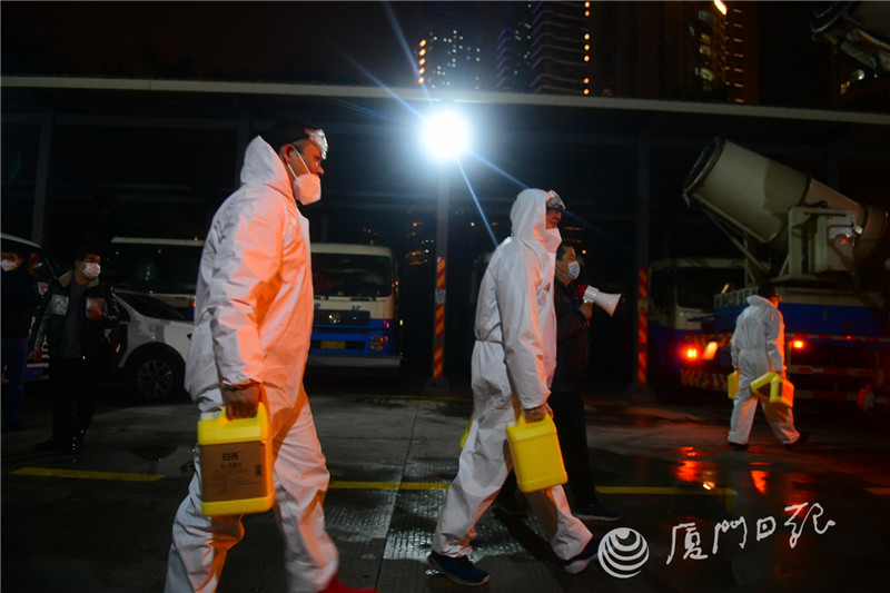 【21:01】加水、加藥,6臺(tái)霧炮車(chē)滿載著10噸左右的消毒水,將于晚上10點(diǎn)開(kāi)始對(duì)思明轄區(qū)主干道、次干道實(shí)施噴灑消毒。思明轄區(qū)共有6條線路,每條線路長(zhǎng)達(dá)二三十公里,車(chē)速控制在30到35公里/每小時(shí),可在1小時(shí)內(nèi)完成消殺。