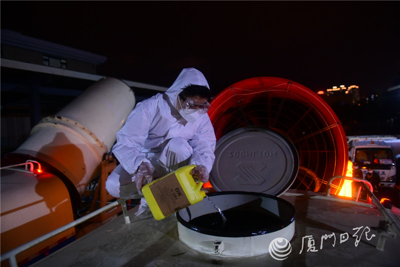 【21:45】今晚九點(diǎn)多,在海滄市政嵩嶼管理站內(nèi),環(huán)衛(wèi)工人按照要求調(diào)配消毒藥劑,隨后將消毒劑灌入霧炮車(chē)的儲(chǔ)水罐。