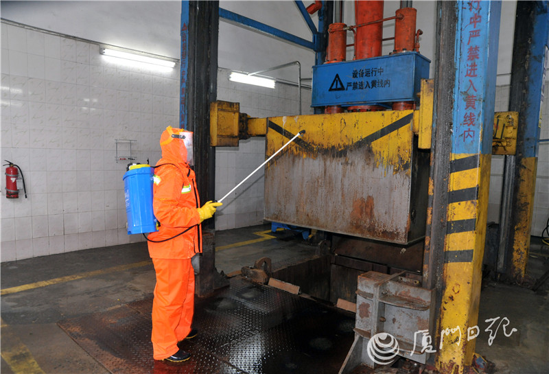 在集美區(qū)僑英街道鳳林清潔樓內(nèi),工作人員在對(duì)垃圾收運(yùn)、處理設(shè)備進(jìn)行消殺。