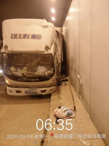 9日凌晨,青礁慈濟(jì)宮下穿隧道東宮隧道廈門往漳州方向,一輛貨車因前輪胎故障撞向路沿石和隧道壁,事發(fā)現(xiàn)場占用一個車道。