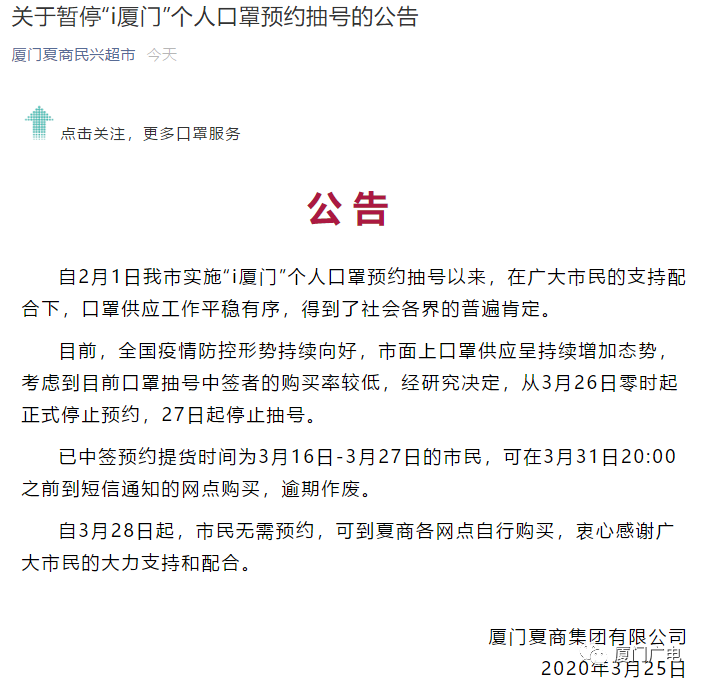 臺海網(wǎng)3月25日訊 據(jù)廈門廣電報道 剛剛,廈門夏商民興超市發(fā)布了一則公告3月26日起,“i廈門”將暫停個人口罩預(yù)約抽號,3月28日起市民無需預(yù)約,可直接到夏商的各網(wǎng)點購買口罩。