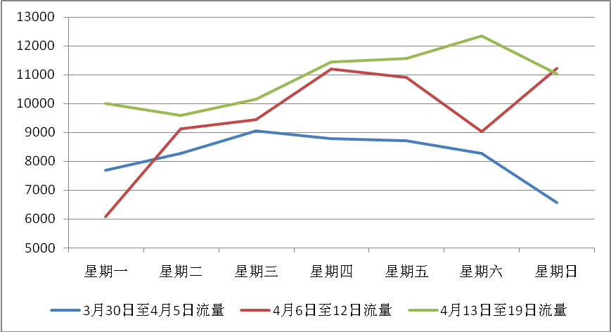 萬石植物園東門(文曾路怪坡路段由南向北)4月12日車流量7826輛次,環(huán)比上一周上升25.31%。