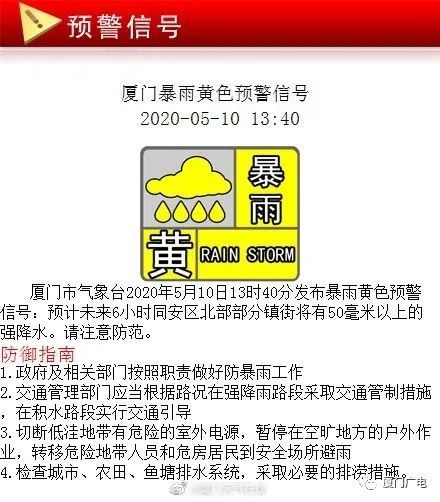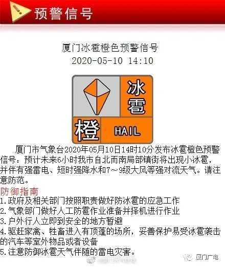 據(jù)廈門天氣在線微博消息,廈門市氣象臺2020年05月10日14時10分發(fā)布冰雹橙色預(yù)警信號:預(yù)計未來6小時我市自北而南局部鎮(zhèn)街將出現(xiàn)小冰雹,并伴有強雷電、短時強降水和7~9級大風(fēng)等強對流天氣。請注意防范。