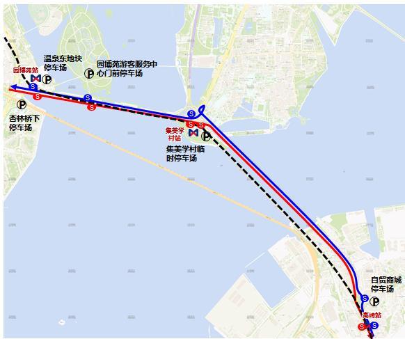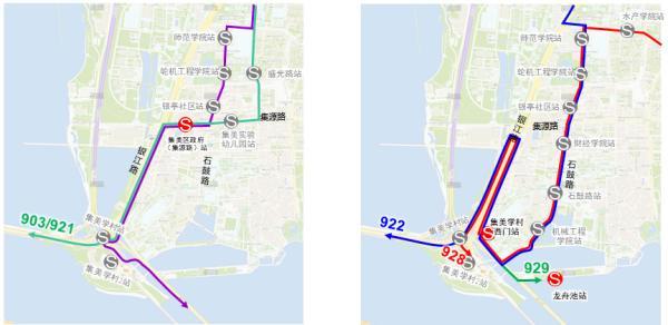 922路、928路走石鼓路-鰲園路-銀江路-集美學(xué)村線路,在同集路-集源路口調(diào)頭,在老學(xué)村附近增設(shè)一個公交臨時??空?。929路截短至龍舟池站,減停集美學(xué)村2站。