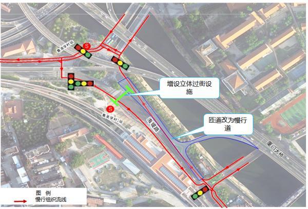 利用現(xiàn)有上橋匝道改造為慢行道,并通過新建的人行天橋橫穿海堤路聯(lián)系集美學(xué)村站。