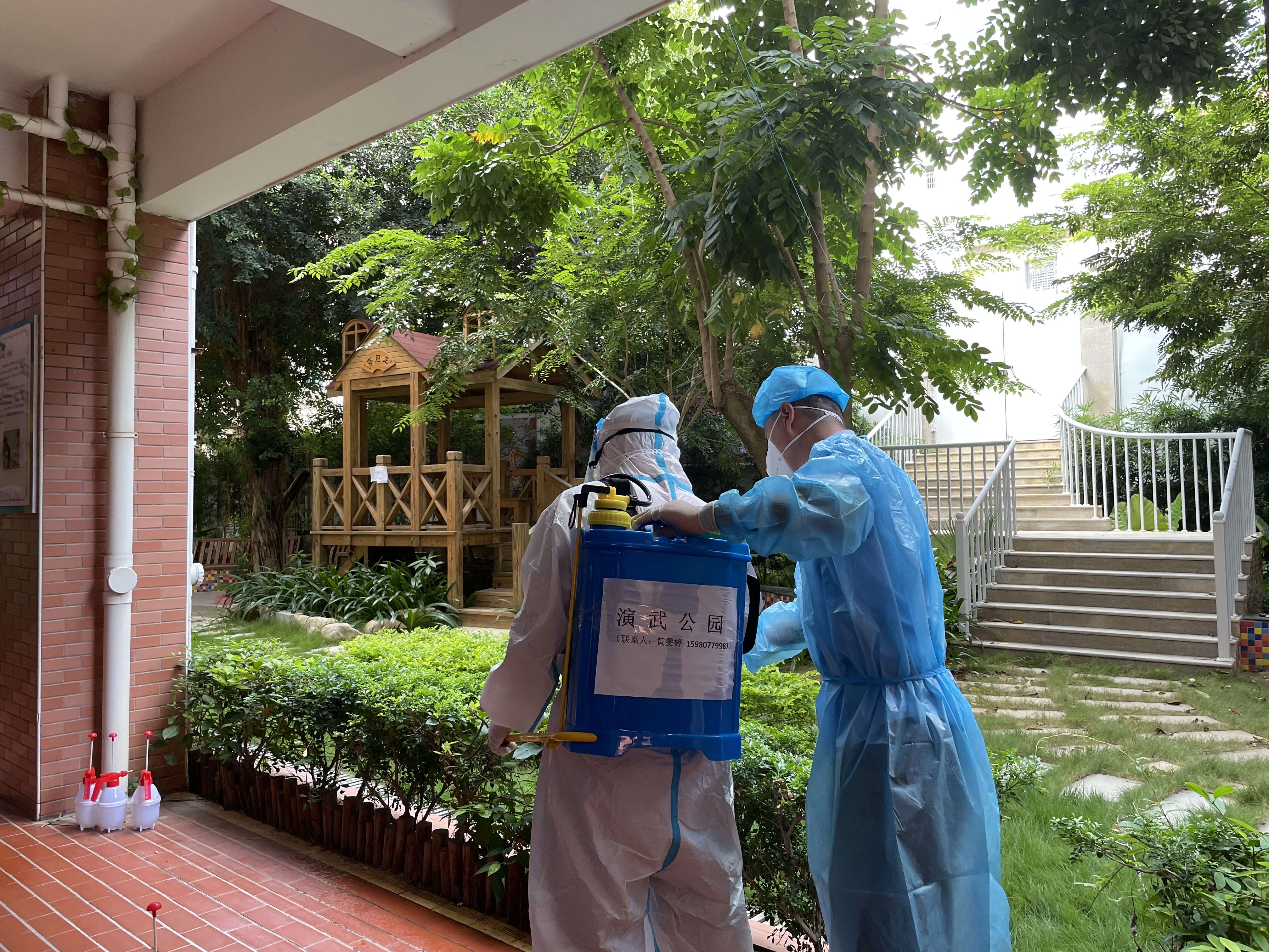 王小龍是大學(xué)城小區(qū)物業(yè)人員,疫情開始后,他主動(dòng)向廈港街道下沃社區(qū)報(bào)名做志愿,爭(zhēng)取到了“消殺員”這一崗位。當(dāng)天早上,王小龍7點(diǎn)多就來(lái)到檢測(cè)點(diǎn)消殺,到早上10點(diǎn)多,他全身已經(jīng)濕透,套著手套的手已經(jīng)被汗?jié)n浸得發(fā)白。“一天要換4套衣服,消毒水換5桶,但只要能保證檢測(cè)現(xiàn)場(chǎng)安全,就不算辛苦!”王小龍開心地說(shuō)。