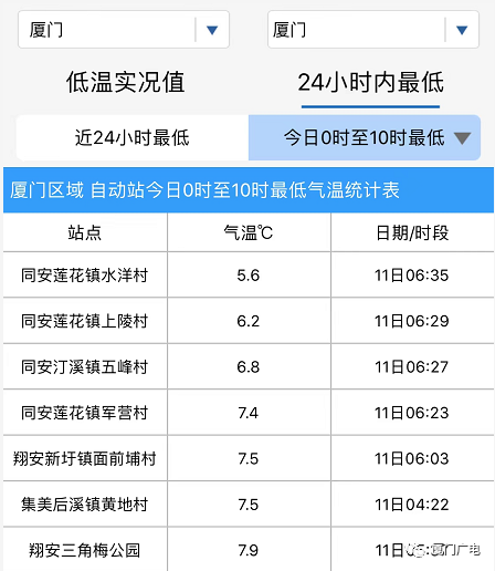 今天清晨,島外不少站點(diǎn)都跌破了8℃