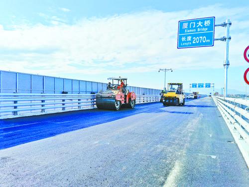 廈門大橋右幅路面攤鋪。(中交一公局供圖)