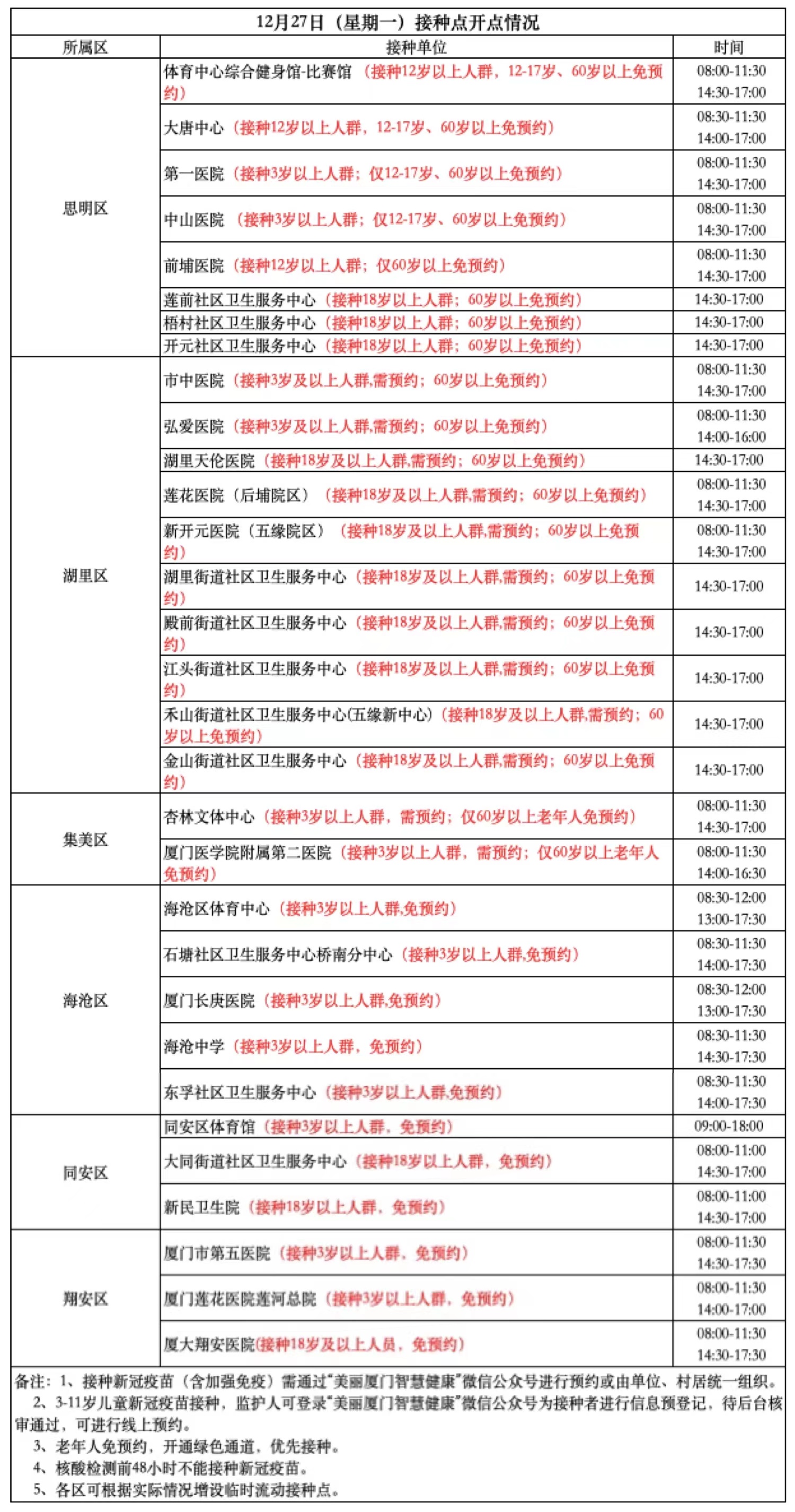 臺(tái)海網(wǎng)12月27日訊 據(jù)廈門網(wǎng)報(bào)道 12月27日,廈門有31個(gè)接種點(diǎn)為市民提供疫苗接種服務(wù)。需要注意的是,接種新冠疫苗(含加強(qiáng)免疫)需通過“美麗廈門智慧健康”微信公眾號(hào)預(yù)約,或由單位、村居統(tǒng)一組織。廈門3-11歲兒童新冠疫苗接種,監(jiān)護(hù)人可登錄“美麗廈門智慧健康”微信公眾號(hào),為接種者進(jìn)行信息預(yù)登記,待后臺(tái)審核通過,可進(jìn)行線上預(yù)約。 (廈門日?qǐng)?bào)記者 陳莼)