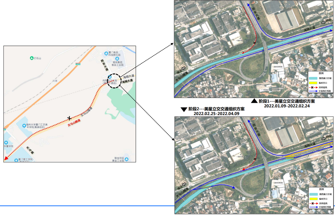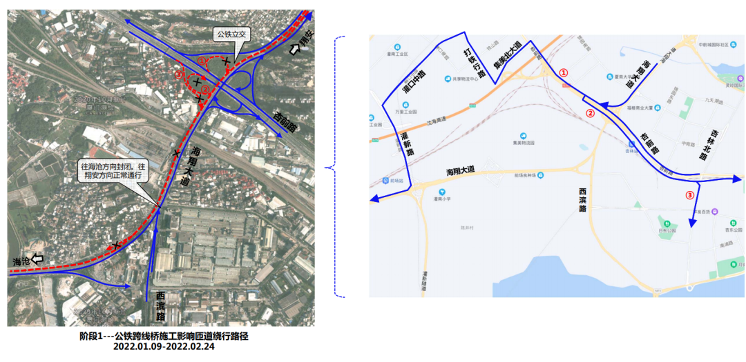 海翔大道西濱路立交至杏前路立交段、海翔大道杏錦路立交至集美大道立交(含西亭隧道)和海翔大道天馬路口至同安大道立交段(含天馬山隧道)機(jī)動(dòng)車實(shí)行由西往東單向行駛(由海滄往翔安方向),禁止機(jī)動(dòng)車由東往西(由翔安往海滄方向)通行,上述立交范圍內(nèi)相關(guān)匝道同步封閉,受限機(jī)動(dòng)車請(qǐng)繞行沈海高速、濱海西大道、同集路和新324國(guó)道等周邊道路。