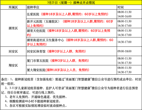 臺海網(wǎng)3月21日訊 據(jù)廈門網(wǎng)報道 21日,廈門有7個疫苗接種點提供新冠疫苗接種服務。接種新冠疫苗(含加強免疫)需通過“美麗廈門智慧健康”微信公眾號進行預約或由單位、村居統(tǒng)一組織。3-11歲兒童新冠疫苗接種,監(jiān)護人可登錄“美麗廈門智慧健康”微信公眾號為接種者進行信息預登記,待后臺審核通過,可進行線上預約。需要提醒大家注意的是,核酸檢測前48小時不能接種新冠疫苗。