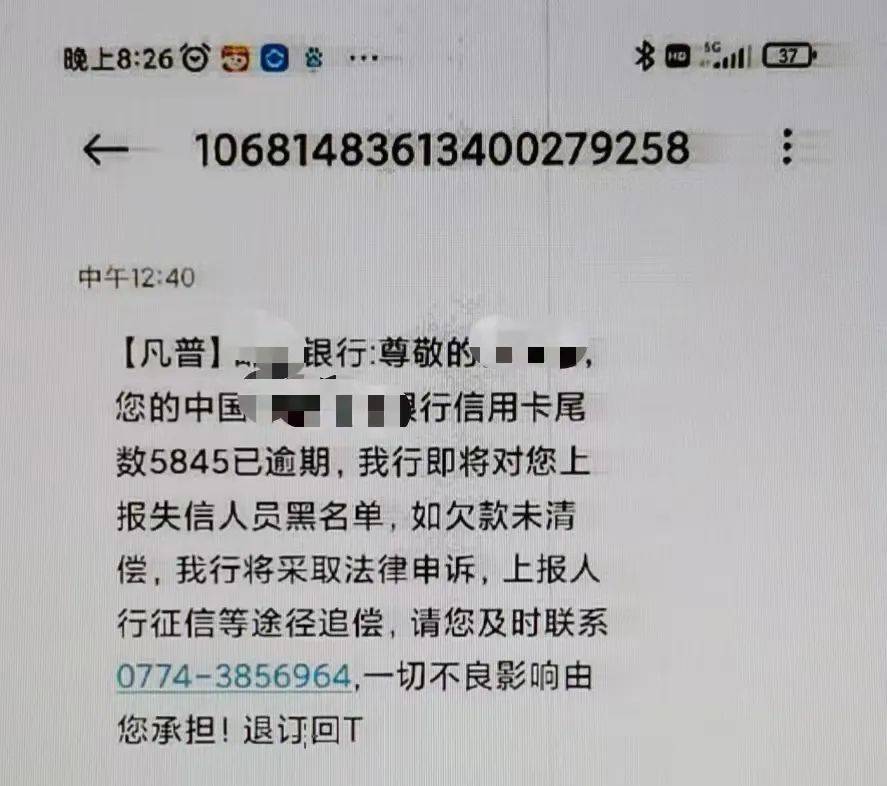 “【凡普】XX銀行:尊敬的XX,您的XX銀行信用卡尾數(shù)5845已逾期,我行即將對您上報失信人員黑名單,如欠款未清償,我行將采取法律申訴,上報人行征信等途徑追償,請您及時聯(lián)系0774-3856964,一切不良影響由您承擔!退訂回T”。
