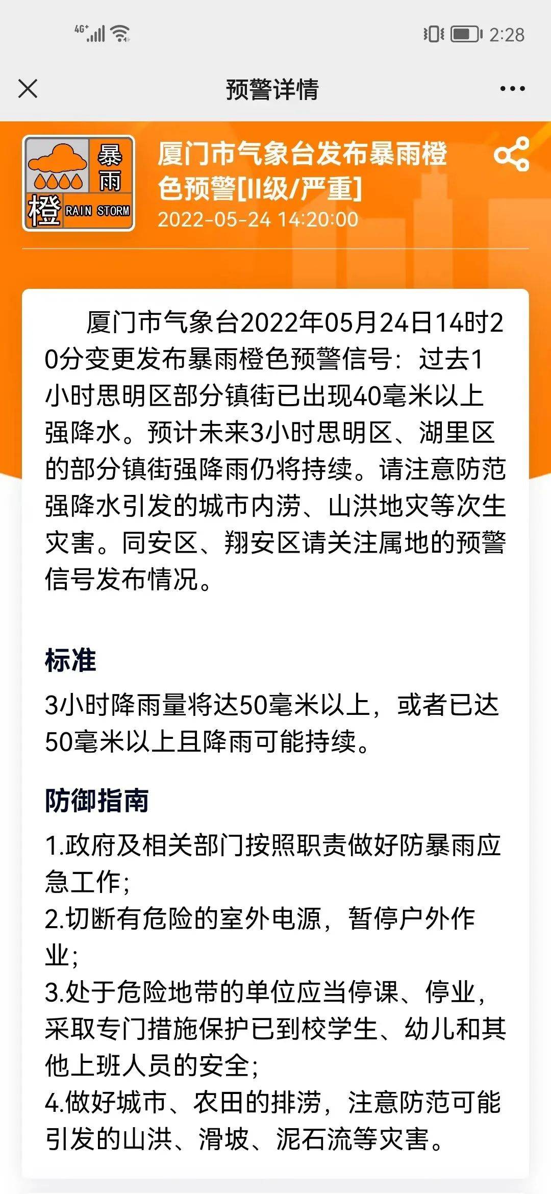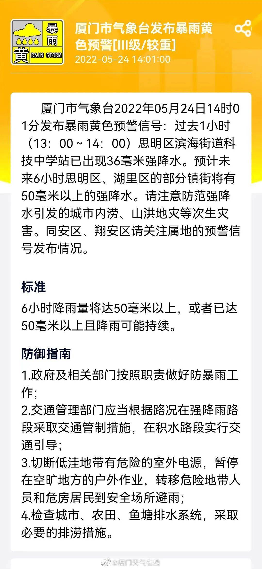 廈門市氣象臺(tái)2022年05月24日14時(shí)01分發(fā)布暴雨黃色預(yù)警信號(hào):過去1小時(shí)(13:00~14:00)思明區(qū)濱海街道科技中學(xué)站已出現(xiàn)36毫米強(qiáng)降水。預(yù)計(jì)未來6小時(shí)思明區(qū)、湖里區(qū)的部分鎮(zhèn)街將有50毫米以上的強(qiáng)降水。請(qǐng)注意防范強(qiáng)降水引發(fā)的城市內(nèi)澇、山洪地災(zāi)等次生災(zāi)害。同安區(qū)、翔安區(qū)請(qǐng)關(guān)注屬地的預(yù)警信號(hào)發(fā)布情況。