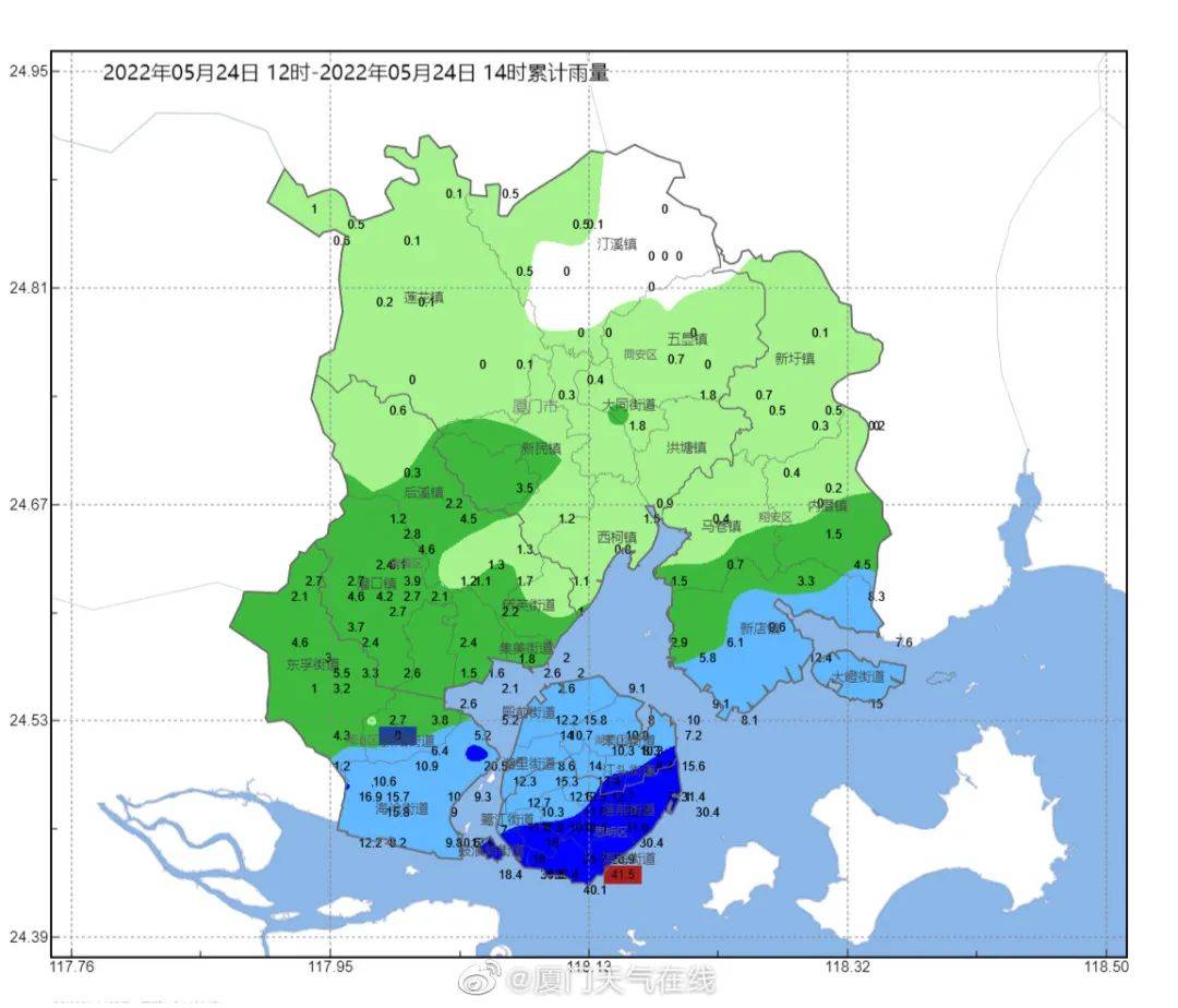 從中午12時(shí)左右就開始慢慢飄毛毛雨,過了沒多久,雨慢慢不受控制開始下大了!過去兩個(gè)小時(shí),思明區(qū)>湖里區(qū)=海滄南部=翔安南部。最大降雨站點(diǎn)出現(xiàn)在思明區(qū)科技中學(xué)站,累計(jì)雨量41.5mm!