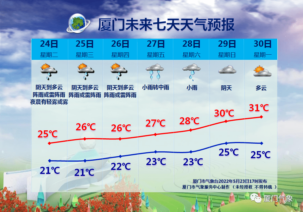 廈門多陰雨天氣,降雨時(shí)局地伴有雷電、短時(shí)強(qiáng)降水和 7~9 級(jí)短時(shí)大風(fēng)等強(qiáng)對(duì)流天氣,最高溫氣溫在25-28℃左右,最低氣溫在21-23℃,晝夜溫差小,降水時(shí),能見度低,出行注意安全。29日起,偏南暖濕氣流加強(qiáng),氣溫有所上升,預(yù)計(jì)最高溫在31℃左右,但還是多分散性的降水,為了不讓自己幸運(yùn)的被“局部”,記得帶上雨傘再出門哦!