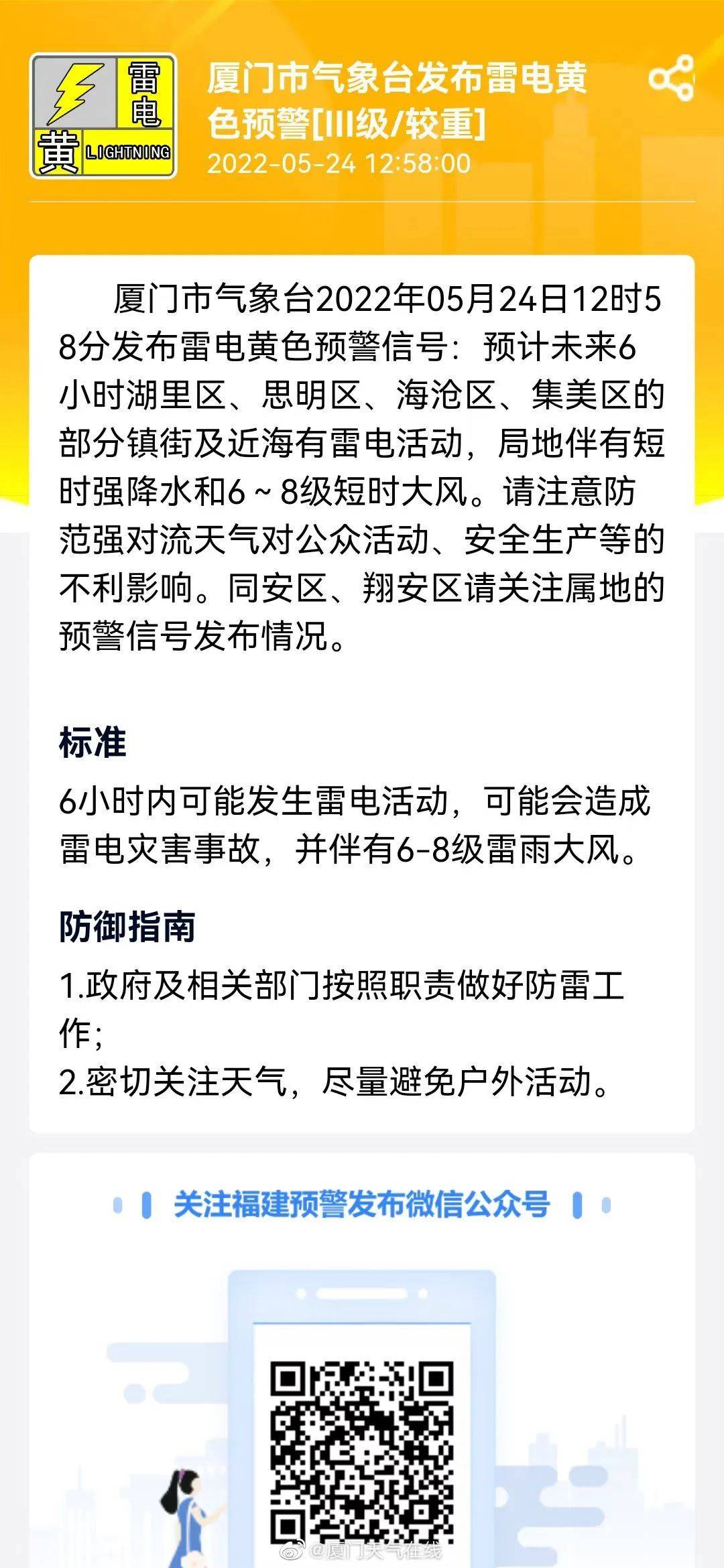 廈門市氣象臺(tái)2022年05月24日12時(shí)58分發(fā)布雷電黃色預(yù)警信號(hào):預(yù)計(jì)未來6小時(shí)湖里區(qū)、思明區(qū)、海滄區(qū)、集美區(qū)的部分鎮(zhèn)街及近海有雷電活動(dòng),局地伴有短時(shí)強(qiáng)降水和6~8級(jí)短時(shí)大風(fēng)。請(qǐng)注意防范強(qiáng)對(duì)流天氣對(duì)公眾活動(dòng)、安全生產(chǎn)等的不利影響。同安區(qū)、翔安區(qū)請(qǐng)關(guān)注屬地的預(yù)警信號(hào)發(fā)布情況。
