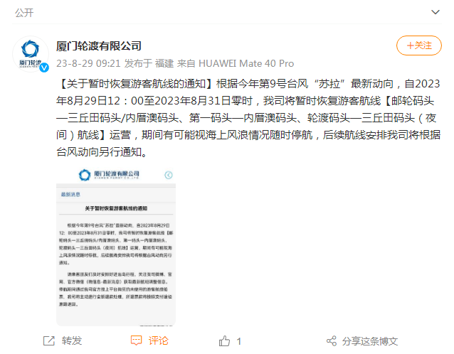 據(jù)@廈門輪渡有限公司 ,根據(jù)今年第9號臺風“蘇拉”最新動向,自2023年8月29日12:00至2023年8月31日零時,我司將暫時恢復游客航線【郵輪碼頭—三丘田碼頭/內厝澳碼頭、第一碼頭—內厝澳碼頭、輪渡碼頭—三丘田碼頭(夜間)航線】運營,期間有可能視海上風浪情況隨時停航,后續(xù)航線安排我司將根據(jù)臺風動向另行通知。