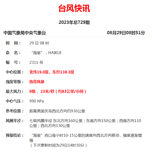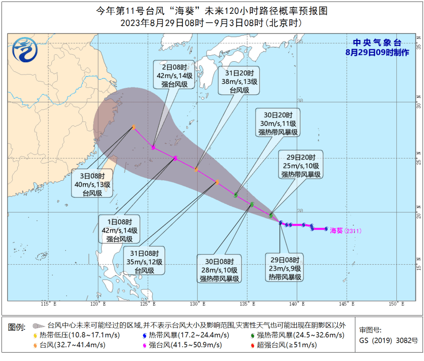29日白天至31日夜間,巴士海峽、臺灣以東洋面、臺灣海峽將有6—8級、陣風9—10級的大風,其中巴士海峽風力可達9—11級、陣風12—13級,臺風“蘇拉”中心經(jīng)過的附近海域風力可達12—14級、陣風15—16級。