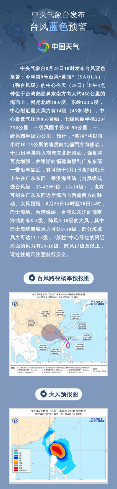 @中央氣象臺 剛剛發(fā)布臺風藍色預警:預計“蘇拉”于31日早晨移入南海東北部海面,強度將再次增強,并逐漸向福建南部到廣東東部一帶沿??拷锌赡苡?月1日夜間到2日上午在廣東東部一帶沿海登陸(臺風級或強臺風級,35-42米/秒,12-14級),也有可能在廣東東部近岸海面向西偏南方向移動。福建廣東將承接臺風“蘇拉”最強降雨。