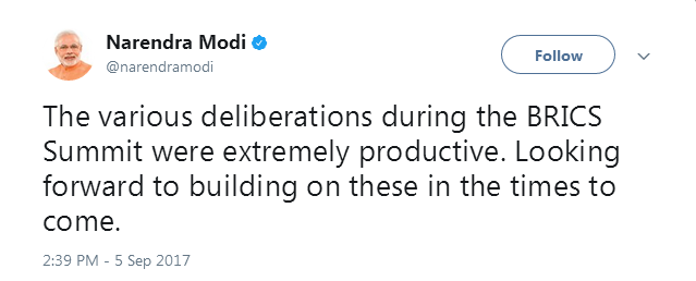 廈門會晤期間,印度總理莫迪至少發(fā)了15條關于“金磚”的推文。其中有3條是這樣的: