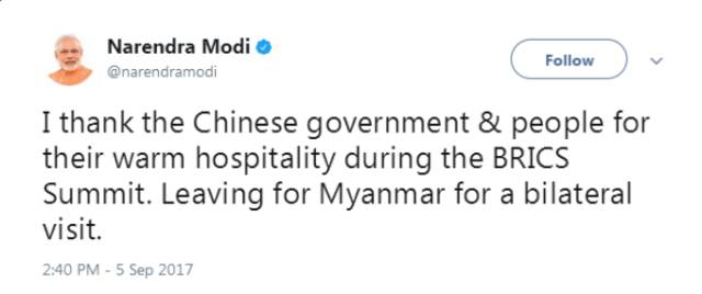 “感謝中國政府和人民在金磚國家領導人會晤期間的盛情款待。我即將動身訪問緬甸。”