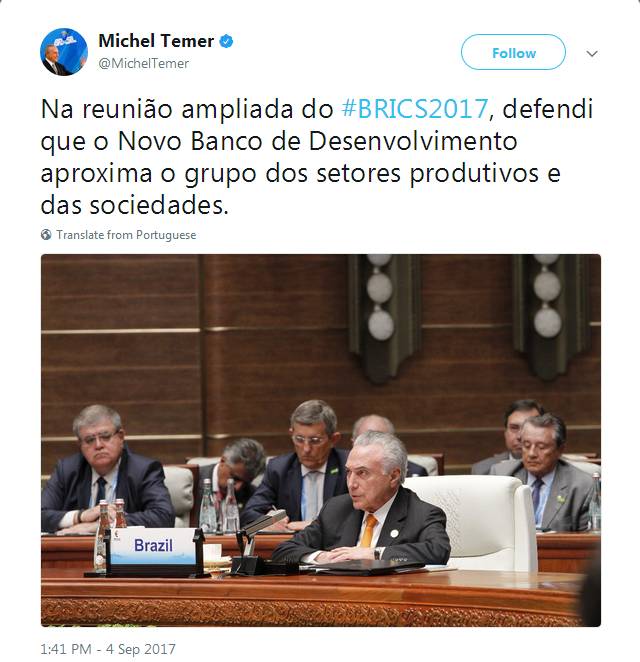 其中一條推文,特梅爾對金磚國家新開發(fā)銀行充滿期待。他說,在4日的金磚國家領導人廈門會晤大范圍會議中,自己呼吁新開發(fā)銀行把生產部門和社會更緊密地聯(lián)結在一起。