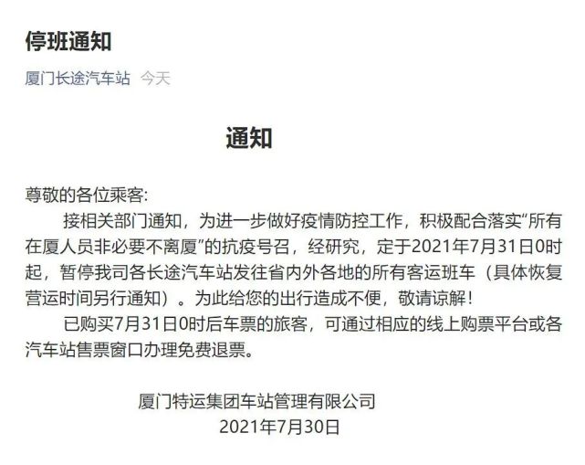 7月30日,廈門長(zhǎng)途客運(yùn)站發(fā)布《停班通知》,于2021年7月31日0時(shí)起,暫停我司各長(zhǎng)途汽車站發(fā)往省內(nèi)外各地的所有客運(yùn)班車(具體恢復(fù)營(yíng)運(yùn)時(shí)間另行通知)。已購(gòu)買7月31日0時(shí)后車票的旅客,可通過(guò)相應(yīng)的線上購(gòu)票平臺(tái)或各汽車站售票窗口辦理免費(fèi)退票。