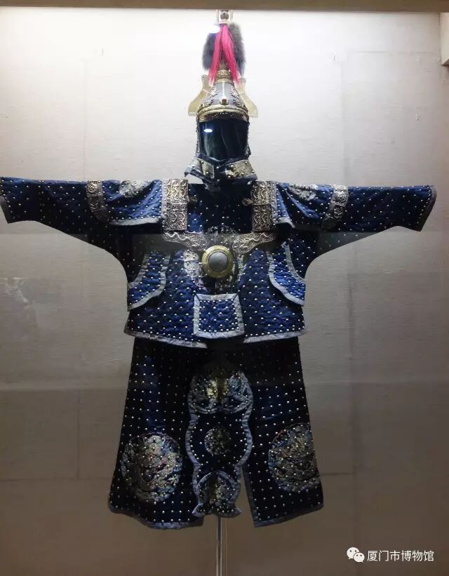 甲為綢面藍布里,內(nèi)敷絲綿,甲面上均勻布滿鍍金銅釘。這套甲胄的頭盔上面的飾物,鳳在上,龍在下。