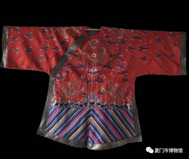 漢式女蟒袍為圓領(lǐng)、寬袖。蟒紋為品字形排列。袖子后面兩端各繡一條蟒。寬袖服裝雙手在前面時,最暴露多的是袖子后面。下擺繡海水江崖。出席重大場合時外罩霞帔。